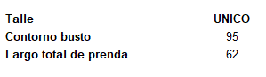 Cada prenda es única y puede tener variaciones en sus medidas según su diseño. Las medidas indicadas en la descripción son aproximadas y se tomaron directamente de la prenda, en centímetros. La etiqueta textil y/o avíos de logo de marca, cordones ajustables y/o botones de la prenda, puede variar según partida de fábrica.