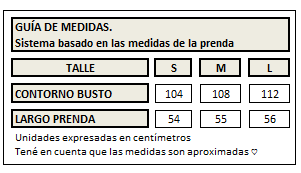 Cada prenda es única y puede tener variaciones en sus medidas según su diseño. Las medidas indicadas en la descripción son aproximadas y se tomaron directamente de la prenda, en centímetros. La etiqueta textil y/o avíos de logo de marca, cordones ajustables y/o botones de la prenda, puede variar según partida de fábrica.