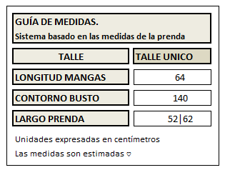 Cada prenda es única y puede tener variaciones en sus medidas según su diseño. Las medidas indicadas en la descripción son aproximadas y se tomaron directamente de la prenda, en centímetros. La etiqueta textil y/o avíos de logo de marca, cordones ajustables y/o botones de la prenda, puede variar según partida de fábrica.