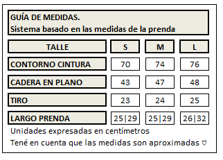 Cada prenda es única y puede tener variaciones en sus medidas según su diseño. Las medidas indicadas en la descripción son aproximadas y se tomaron directamente de la prenda, en centímetros. La etiqueta textil y/o avíos de logo de marca, cordones ajustables y/o botones de la prenda, puede variar según partida de fábrica.