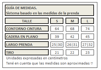Cada prenda es única y puede tener variaciones en sus medidas según su diseño. Las medidas indicadas en la descripción son aproximadas y se tomaron directamente de la prenda, en centímetros. La etiqueta textil y/o avíos de logo de marca, cordones ajustables y/o botones de la prenda, puede variar según partida de fábrica.