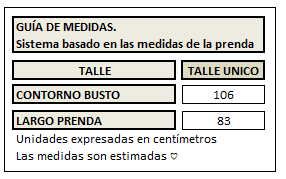 Cada prenda es única y puede tener variaciones en sus medidas según su diseño. Las medidas indicadas en la descripción son aproximadas y se tomaron directamente de la prenda, en centímetros. La etiqueta textil y/o avíos de logo de marca, cordones ajustables y/o botones de la prenda, puede variar según partida de fábrica.